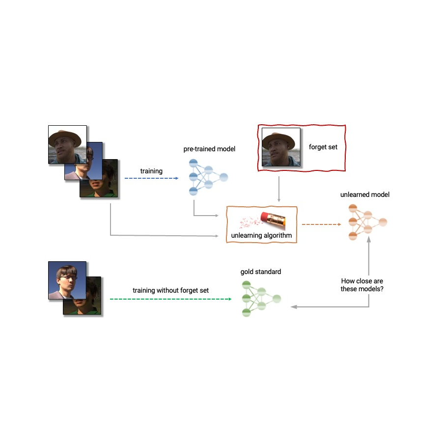 | Anatomy of unlearning. An unlearning algorithm takes as input a pre-trained model and one or more samples from the train set to unlearn (the “forget set”). From the model, forget set, and retain set, the unlearning algorithm produces an updated model. An ideal unlearning algorithm produces a model that is indistinguishable from the model trained without the forget set. |