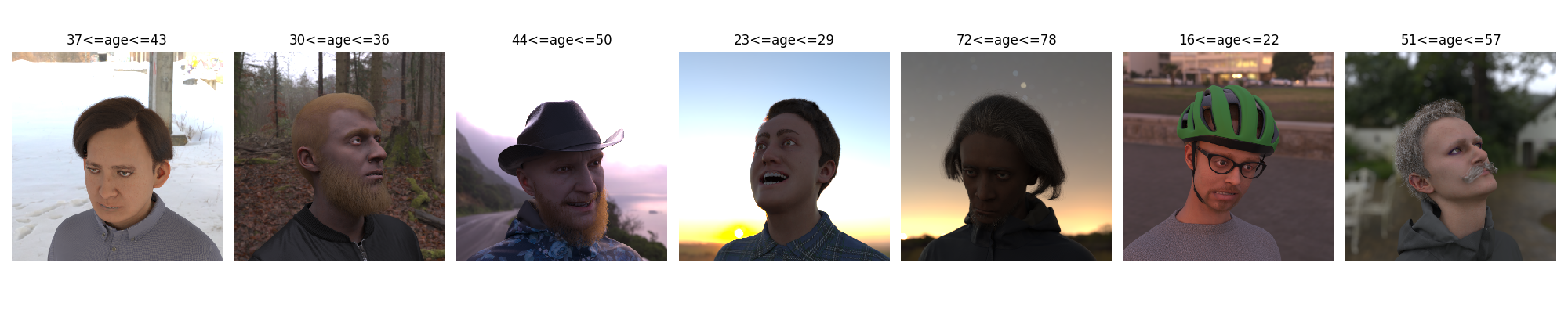 | Excerpt images from the Face Synthetics dataset together with age annotations. The competition considers the scenario in which an age predictor has been trained on face images like the above, and, after training, a certain subset of the training images must be forgotten. |