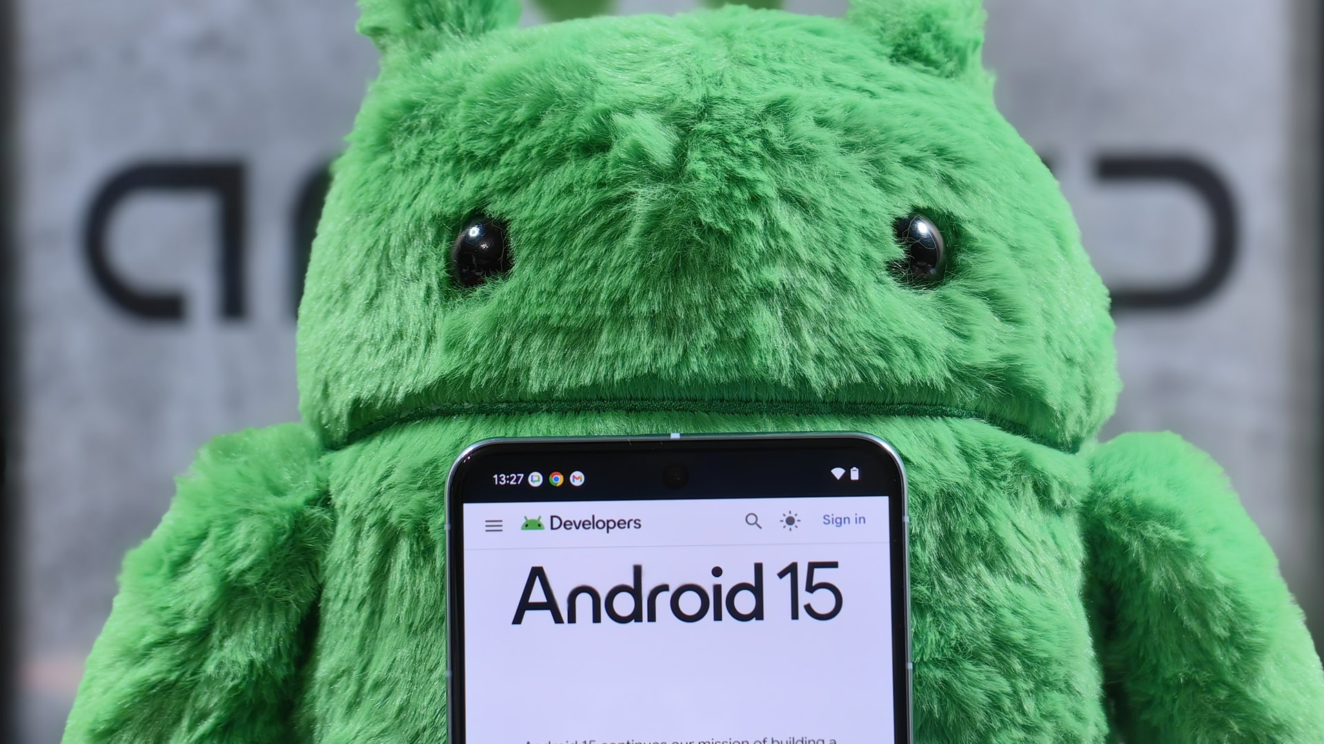 Pixel 8 Pro in front of an Android plushie