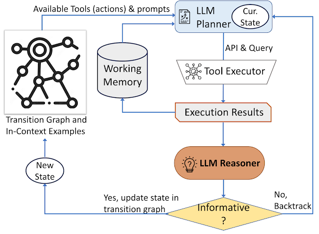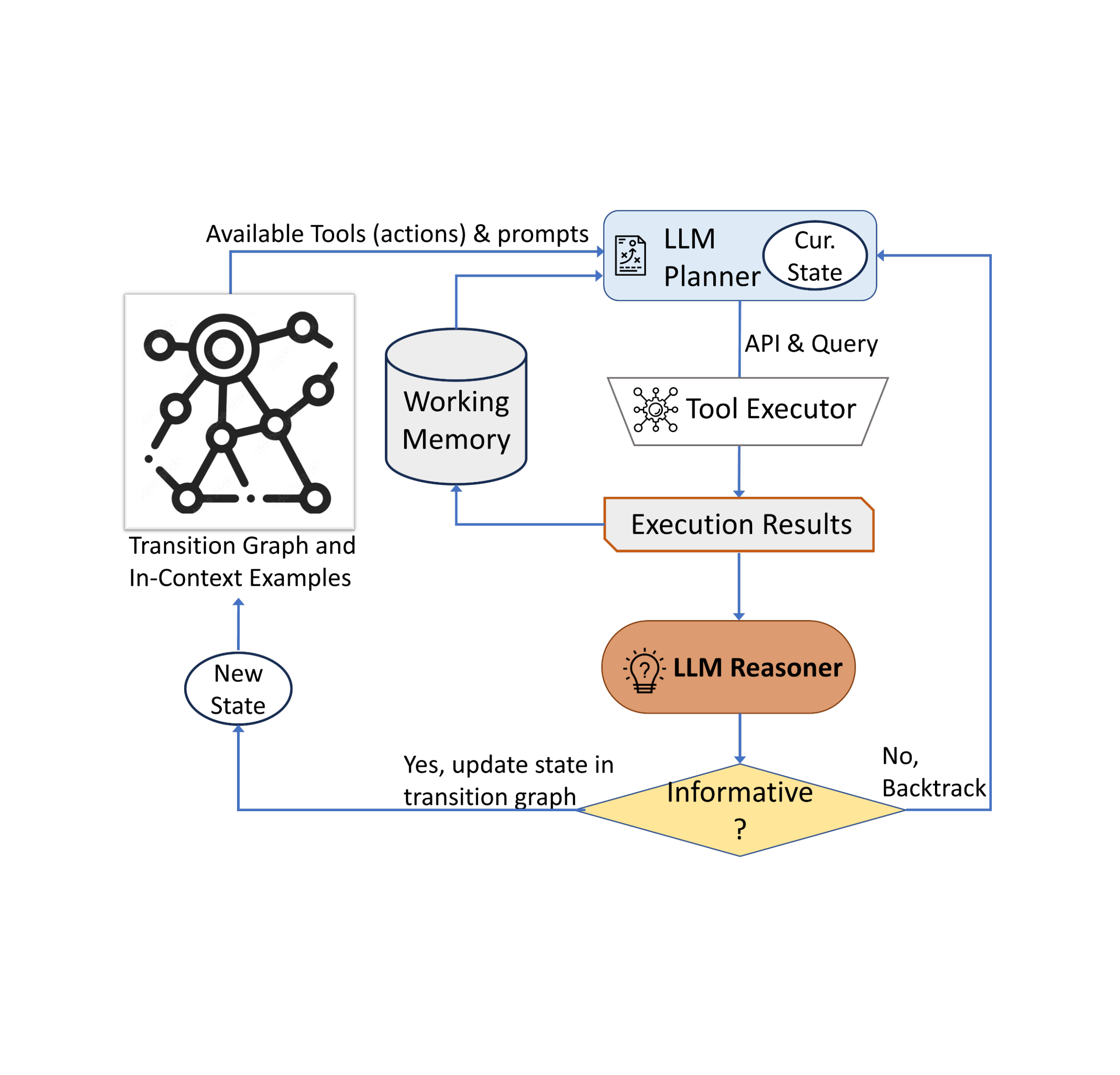 The planner undertakes a series of steps each time a decision is required regarding which tool to employ and what query to send to it. Based on the present state, the planner provides a range of potential subsequent actions. The potential action space may be so large that it makes the search space intractable. To address this issue, the planner refers to the transition graph to eliminate irrelevant actions. The planner also excludes the actions that have already been taken before and are stored in the working memory.