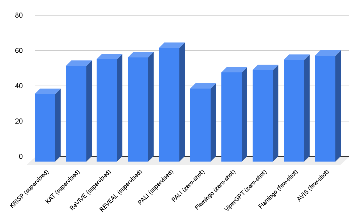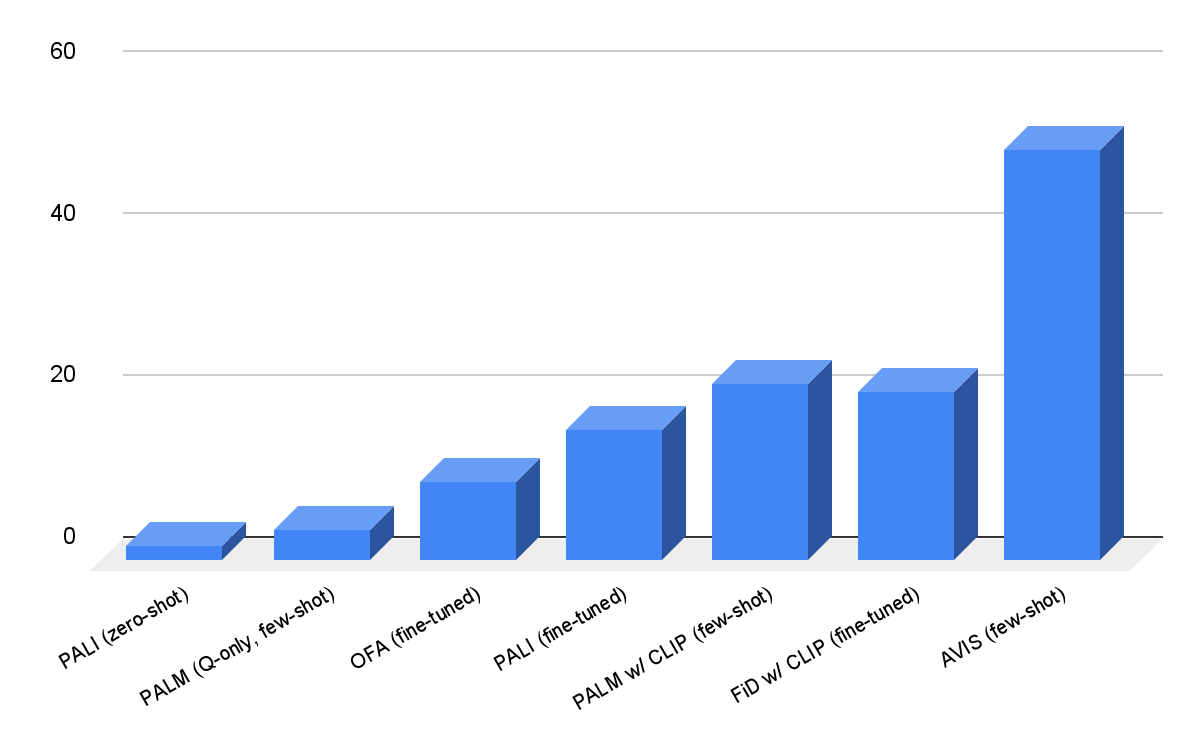 | Visual question answering results on A-OKVQA. AVIS achieves higher accuracy in comparison to previous works that use few-shot or zero-shot learning, including Flamingo, PaLI and ViperGPT. AVIS also achieves higher accuracy than most of the previous works that are fine-tuned on OK-VQA dataset, including REVEAL, ReVIVE, KAT and KRISP, and achieves results that are close to the fine-tuned PaLI model. |
