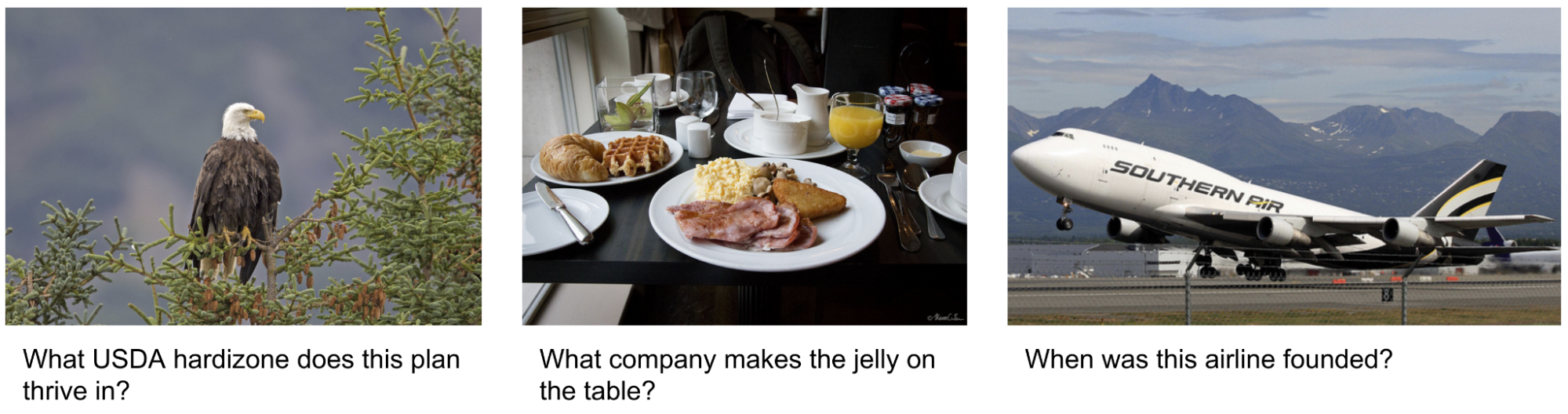 | Examples of visual information seeking queries where external knowledge is required to answer the question. Images are taken from the OK-VQA dataset. |