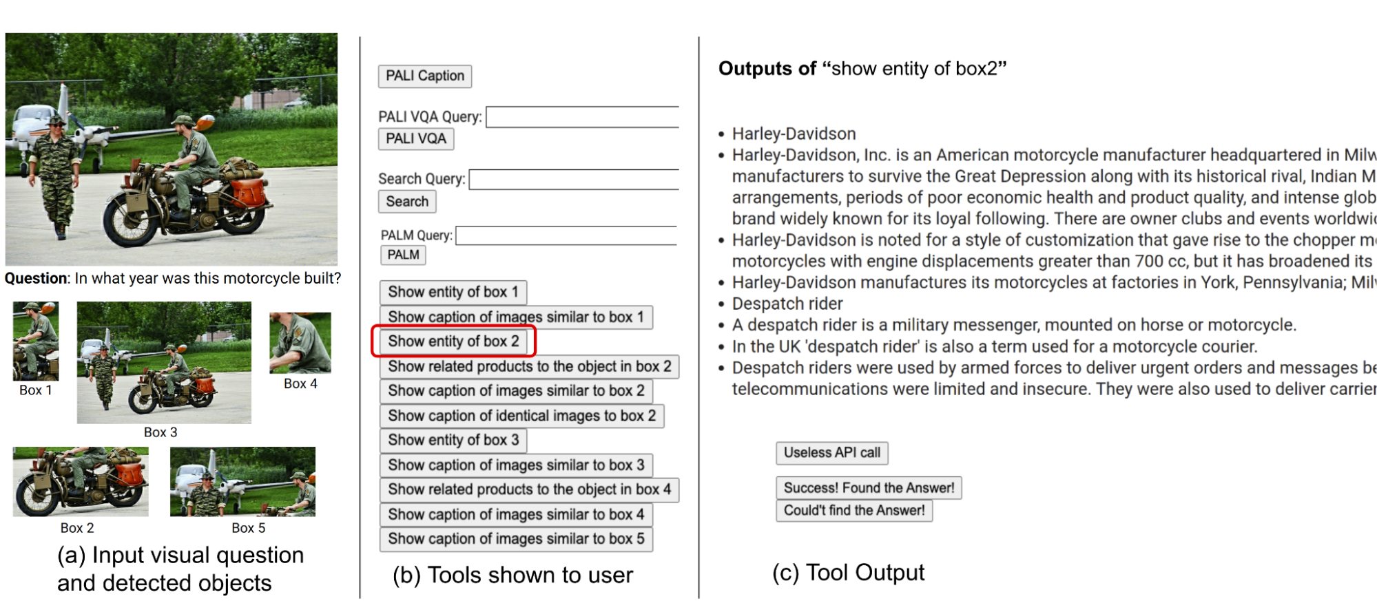In “AVIS: Autonomous Visual Information Seeking with Large Language Models”, we introduce a novel method that achieves state-of-the-art results on visual information seeking tasks. Our method integrates LLMs with three types of tools: (i) computer vision tools for extracting visual information from images, (ii) a web search tool for retrieving open world knowledge and facts, and (iii) an image search tool to glean relevant information from metadata associated with visually similar images. AVIS employs an LLM-powered planner to choose tools and queries at each step. It also uses an LLM-powered reasoner to analyze tool outputs and extract key information. A working memory component retains information throughout the process.