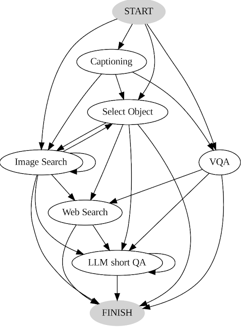 We record user actions and outputs and use it as a guide for our system in two key ways. First, we construct a transition graph (shown below) by analyzing the sequence of decisions made by users. This graph defines distinct states and restricts the available set of actions at each state. For example, at the start state, the system can take only one of these three actions: PALI caption, PALI VQA, or object detection. Second, we use the examples of human decision-making to guide our planner and reasoner with relevant contextual instances to enhance the performance and effectiveness of our system.