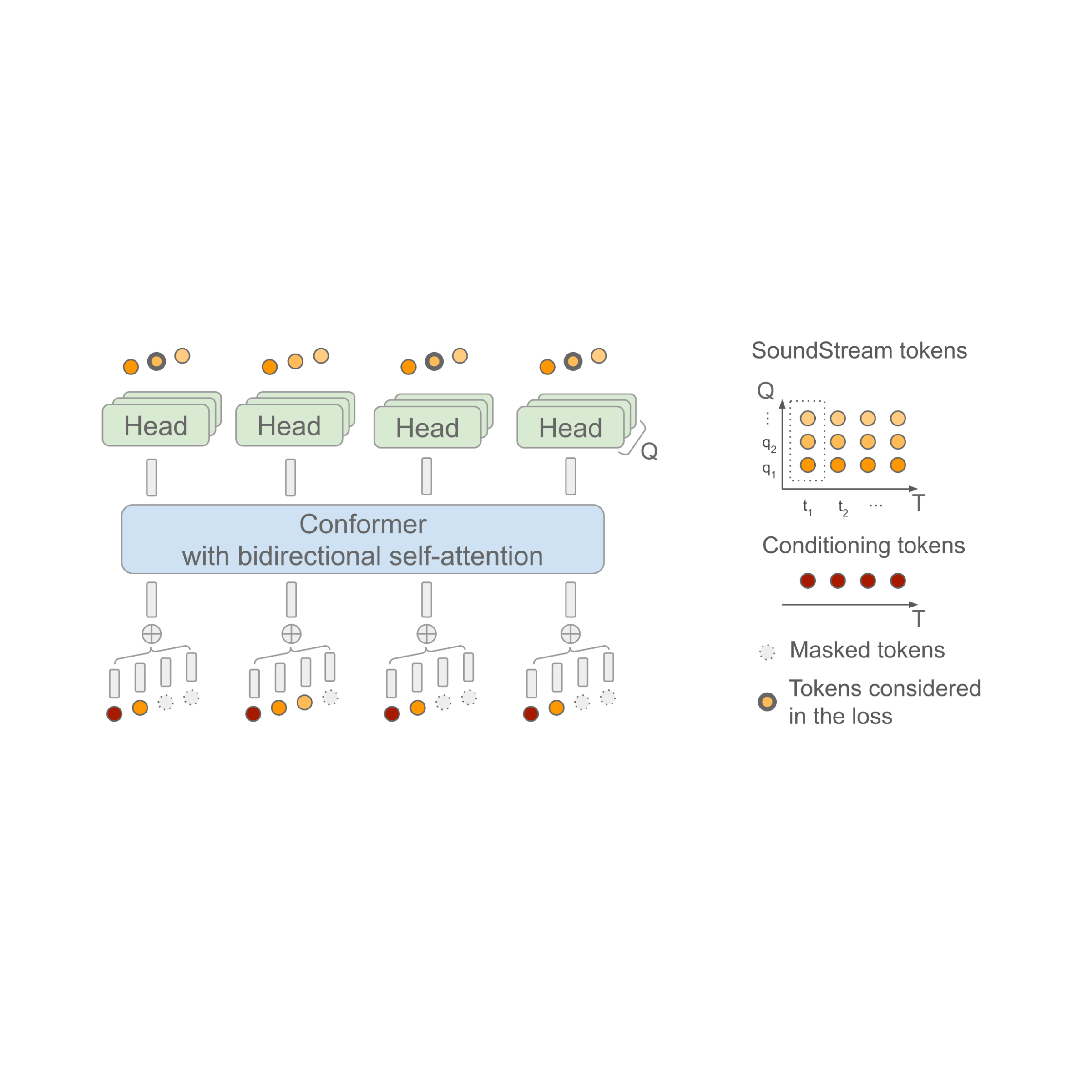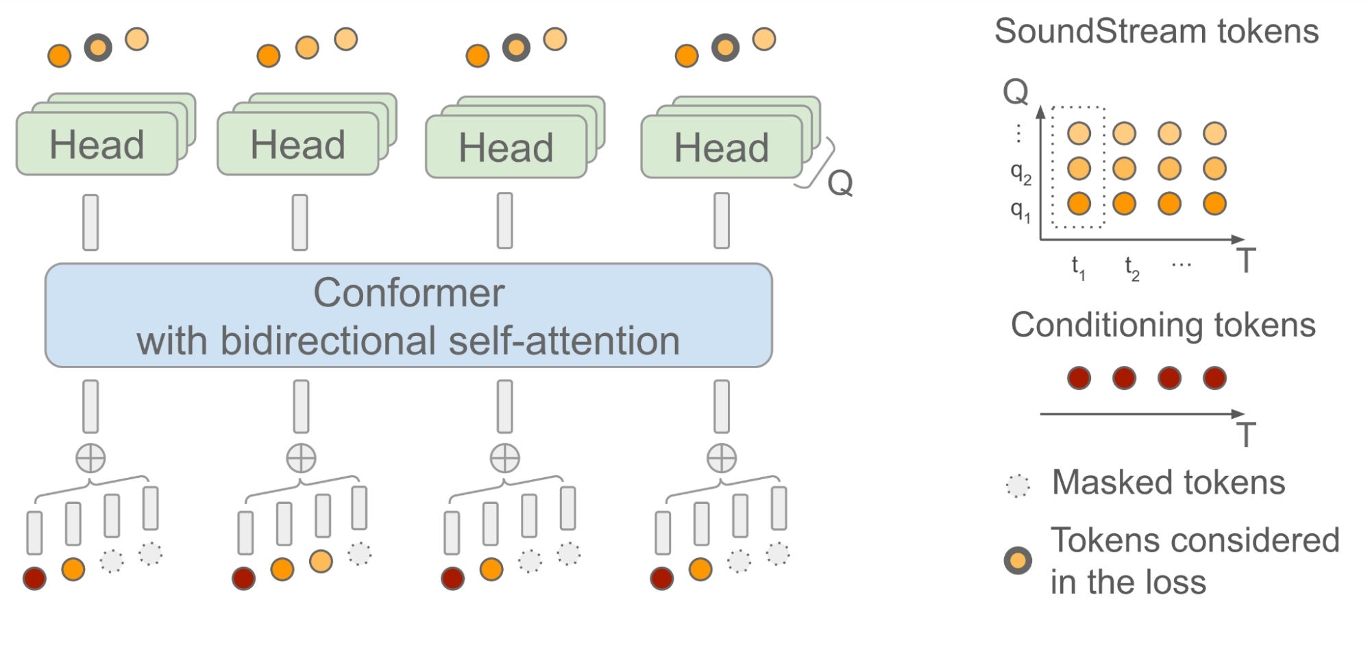 SoundStorm relies on a bidirectional attention-based Conformer, a model architecture that combines a Transformer with convolutions to capture both local and global structure of a sequence of tokens. Specifically, the model is trained to predict audio tokens produced by SoundStream given a sequence of semantic tokens generated by AudioLM as input. When doing this, it is important to take into account the fact that, at each time step t, SoundStream uses up to Q tokens to represent the audio using a method known as residual vector quantization (RVQ), as illustrated below on the right. The key intuition is that the quality of the reconstructed audio progressively increases as the number of generated tokens at each step goes from 1 to Q.