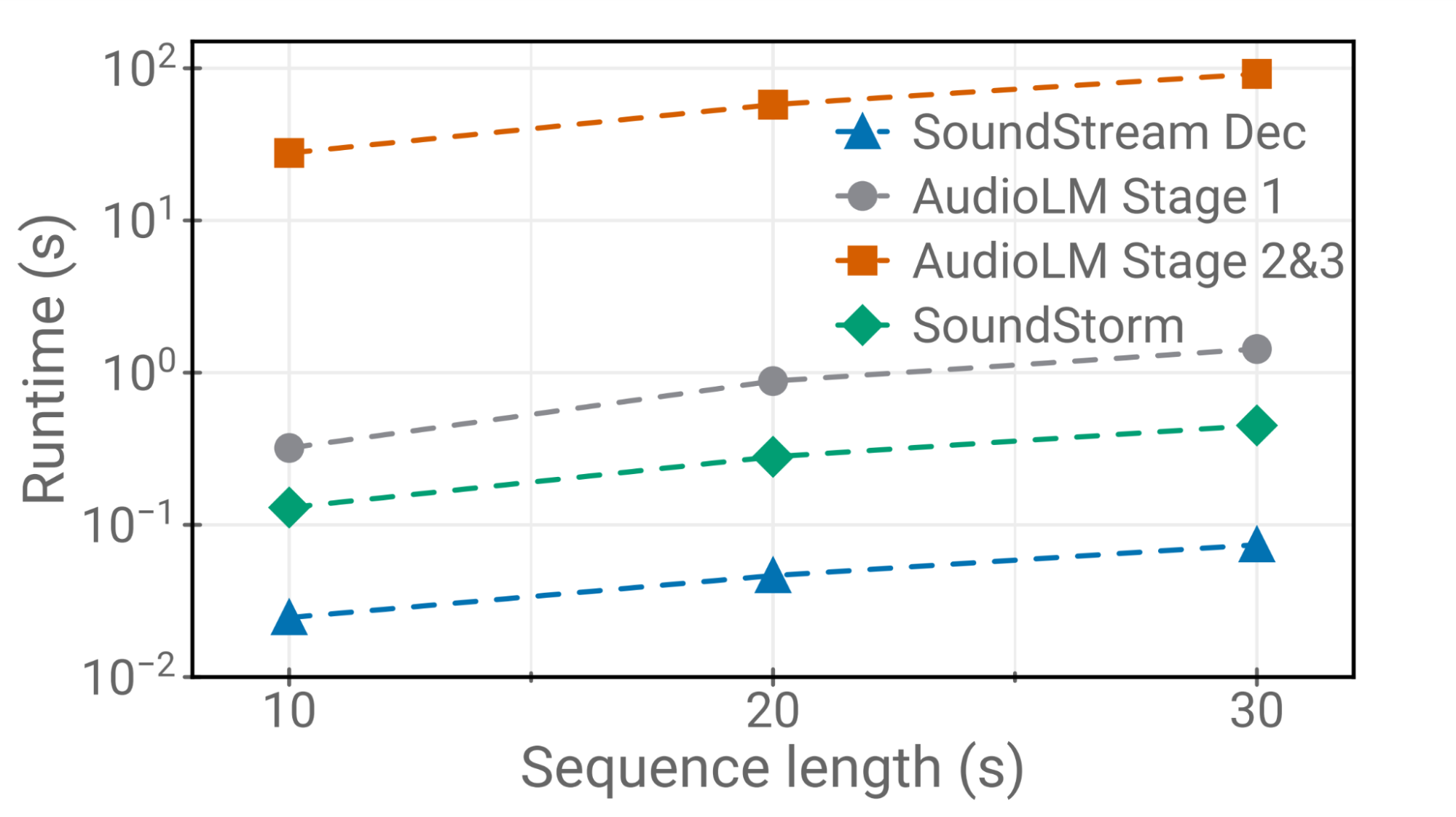 | Runtimes of SoundStream decoding, SoundStorm and different stages of AudioLM on a TPU-v4. |