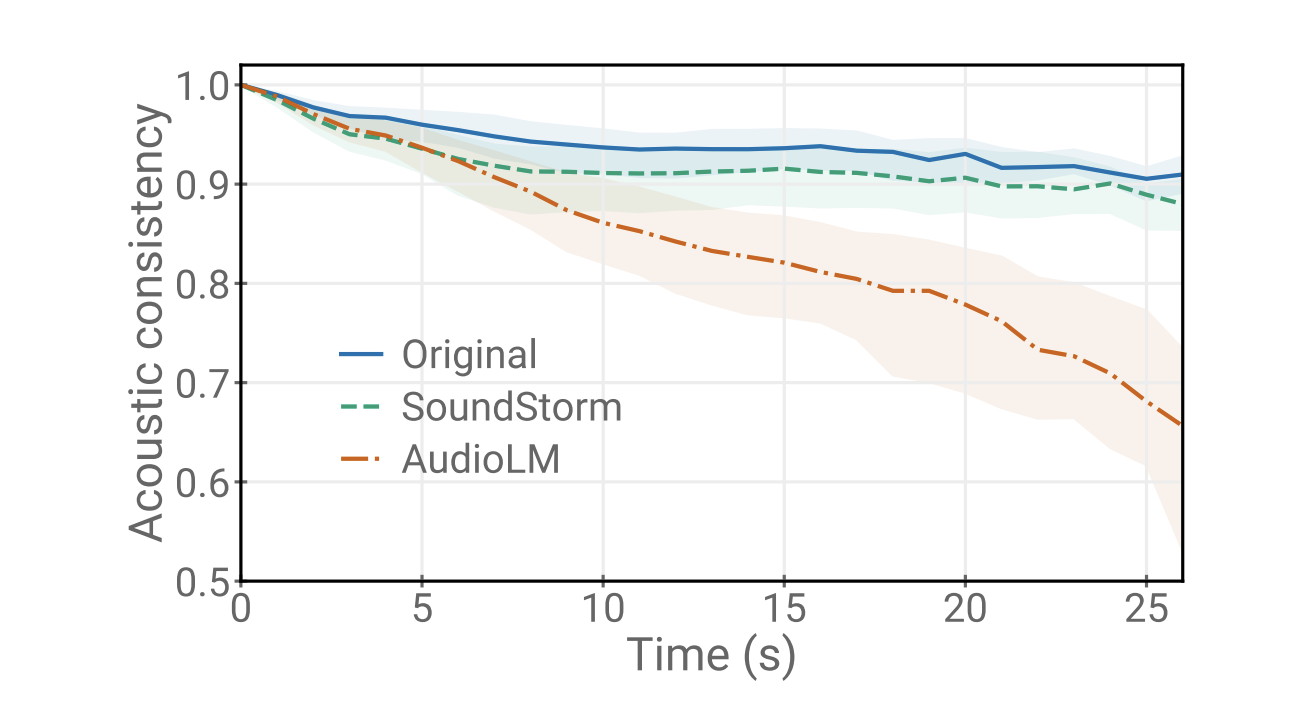 | Acoustic consistency between the prompt and the generated audio. The shaded area represents the inter-quartile range. |